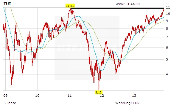 Charttechniker sind sich einig: Gelingt nun auch noch der Sprung über den horizontalen Widerstand bei elf Euro, würde die TUI-Aktie ein massives Kaufsignal generieren. Im Anschluss wäre der Weg bis in den Bereich 14,00 Euro geebnet.