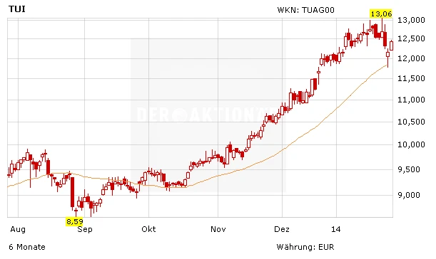 Die Deutsche Bank hat ihre Kaufempfehlung für die TUI-Aktie belassen und das Kursziel von 11,40 Euro auf 14,00 Euro angehoben. Das Tempo der Veränderungen unter dem neuen Vorstandsvorsitzenden Friedrich Joussen sei deutlich zu spüren. Der Touristikkonzern schüttet erstmals seit 2007 wieder eine Dividende aus, dass komme zwei Jahre früher als erwartet, schrieb Analyst Geof Collyer in seiner Studie am Dienstag. Beim Umstrukturierungsprogramm oneTUI liege der Reisekonzern über Plan.
