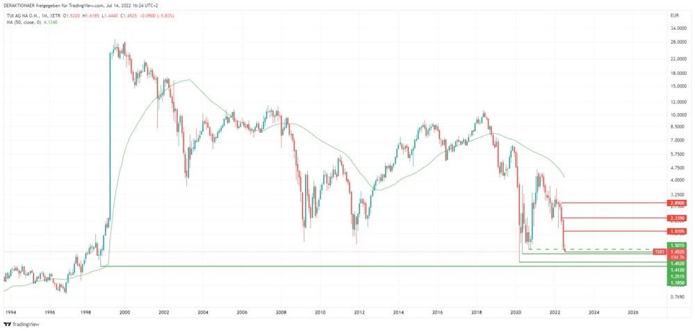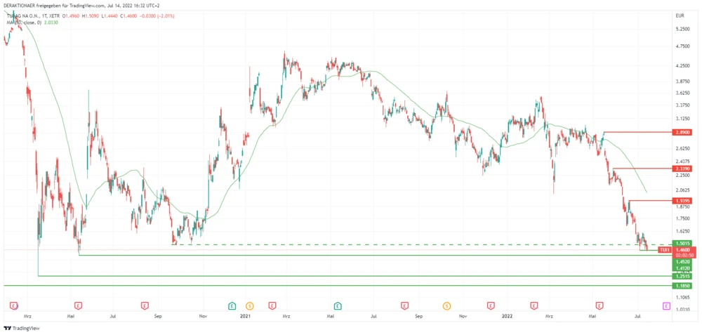 Dies könnte zu einer Kettenreaktion führen, da unter solch markanten Marken oft viele Verkaufsorders und Stopps platziert werden. Zudem befindet sich bei 1,41 Euro ein weiterer Support, der ebenfalls den Bären zum Opfer fallen könnte, da der Abwärtstrend so stark ausgeprägt ist. Im Anschluss steht das Tief aus dem Corona-Crash bei 1,25 Euro im Fokus. Findet die Aktie auch hier keinen Halt, könnte es richtig bitter werden. Unterschreitet der Kurs diese Marke, würde die TUI-Aktie so tief wie zuletzt 1998 notieren.