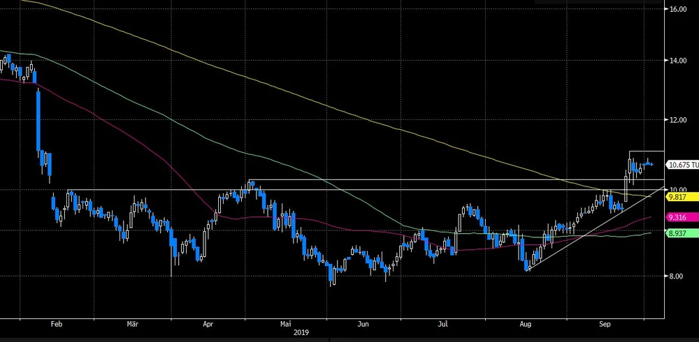 So notieren die TUI-Anteile nun knapp unter dem Mehr-Monats-Hoch bei 11,06 Euro. Diese Marke wurde am vergangenen Dienstag im Zuge der Rallye zahlreicher Touristik- und Luftfahrtaktien nach der Pleite von Thomas Cook markiert. Nach der charttechnisch absolut gesunden Konsolidierungsbewegung der letzten Handelstage hat sich der Kurs allmählich wieder an dieses Hoch angenähert.