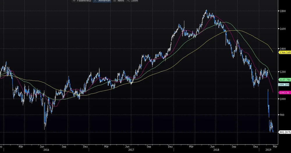 So ist die TUI-Aktie an der Londoner Börse erstmals seit Aufnahme des dortigen Handels im Jahre 2014 unter die Marke von 800 Britischen Pence gerutscht. Damit wurde eigentlich ein neues Verkaufssignal generiert, aber noch hält sich die Aktie wieder knapp oberhalb dieser wichtigen Unterstützung. Dennoch dienen derartige Rücksetzer natürlich keinesfalls dem Versuch einer nachhaltigen Bodenbildung.