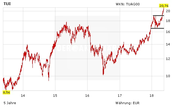 Angesichts dieser guten Aussichten sowie der ohnehin zuletzt starken Geschäftsentwicklung ist es natürlich wenig verwunderlich, dass der Aktienkurs nun ein neues Mehrjahres-Hoch markiert hat. Nun hätte die TUI-Aktie zunächst Luft bis zum Widerstand bei 20,14 Euro. Wird auch diese Hürde genommen, könnte es bis in den Bereich von 21,80 bis 22,10 Euro gehen, die Höchststände aus dem Jahr 2007. Zwar sollten Anleger gerade bei einer zuletzt derart gut gelaufenen Aktie bedenken, dass die Gefahr von Kursrückgängen im Zuge von Gewinnmitnahmen natürlich immer gegeben ist. Grundsätzlich stimmt der Trend bei TUI aber – fundamental wie auch charttechnisch betrachtet.