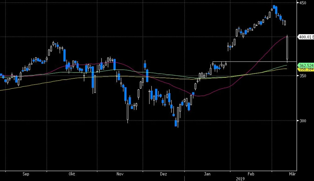 Mit der Boeing-Aktie ging es indes im gestrigen Handel kräftig bergab. Der Dow-Jones-Wert verbuchte nach einem zweistelligen Kursrückgang nach Handelseröffnung den stärksten Verlust seit dem 11. September 2001. Allerdings erholte sich die Aktie im weiteren Handelsverlauf wieder deutlich, nachdem das Ende Januar im Zuge starker Quartalsergebnisse aufgerissene Gap bei 360 Dollar geschlossen wurde. Zudem ist Boeing immer noch seit Jahresbeginn der stärkste Wert im US-Leitindex.