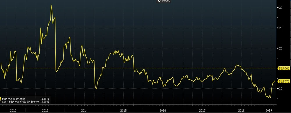 So liegt das KGV für das laufende Geschäftsjahr mit 12 trotz des jüngsten Kursanstiegs immer noch deutlich unter dem Durchschnitt der vergangenen Jahre von 15 (siehe Chart).