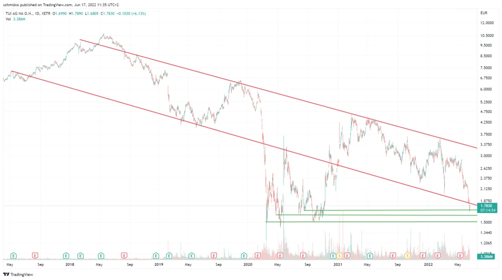 Die TUI-Aktie hat am gestrigen Donnerstag ein deutliches Verkaufssignal generiert, als sie durch die untere Begrenzung des langfristigen Abwärtskanals bei 1,83 Euro gerutscht ist. Aktuell testet sie die Unterstützung an einem Tief vom August 2020 bei 1,70 Euro.