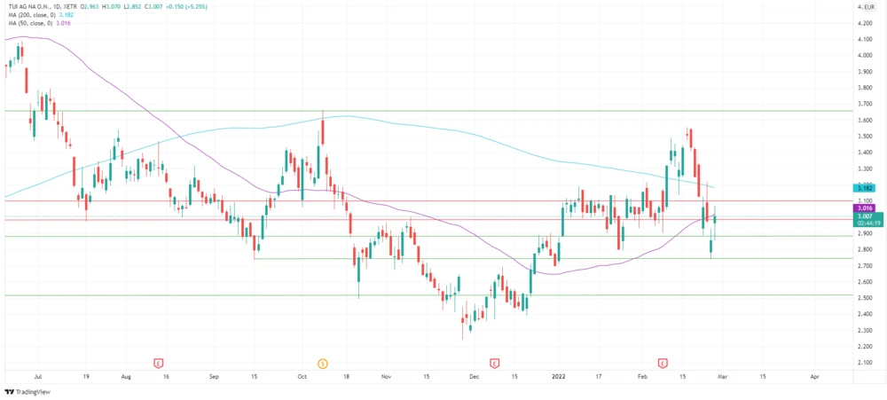 Im Zuge der russischen Invasion fiel die TUI-Aktie bis an die Unterstützung am Zwischentief bei 2,74 Euro und notierte damit so tief wie zuletzt zum Jahresbeginn.