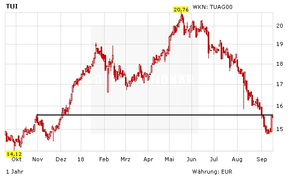 Doch auch ohne die Aktienkäufe von Mordashov ist die TUI-Aktie einen genaueren Blick wert. Der Reisekonzern verfügt über eine sehr solide Bilanz, eine starke Stellung in zahlreichen attraktiven Märkten und wächst kontinuierlich. Zudem ist die Aktie mit einem KGV von 11 noch günstig bewertet und bietet Dividendenjägern aktuell eine Rendite von fünf Prozent. Gelingt nun der Sprung über das Zwischenhoch bei 15,60 Euro, hätte sich das zuvor angeschlagene Chartbild auch wieder etwas aufgehellt. Mutige können zugreifen (Stopp: 13,80 Euro).
