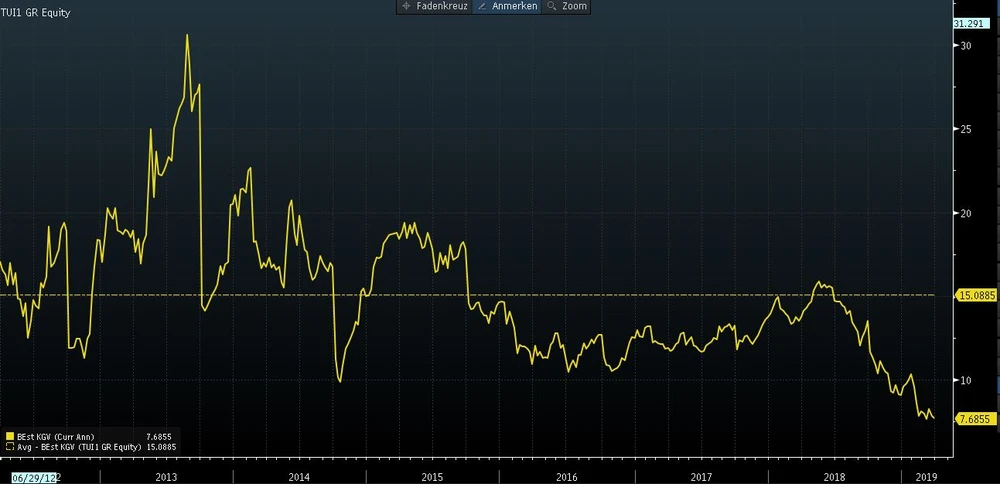 Blickt man auf die historische Bewertung, so wurden die TUI-Anteile in den vergangenen sieben Jahren mit einem durchschnittlichen KGV von 15 bewertet (siehe Chart). Dementsprechend müsste der Kurs fast doppelt so hoch stehen wie aktuell. Würde man als fairen Wert etwa ein KGV von 10 ansetzen (da die TUI in den vergangenen Jahren die Gewinne meist um zehn Prozent steigern konnte und dies auch künftig wieder anpeilen dürfte), so würde sich bei einem für 2020 erwarteten Netttoergebnis von 1,29 Euro je Aktie ein Kursziel von 12,90 Euro errechnen.