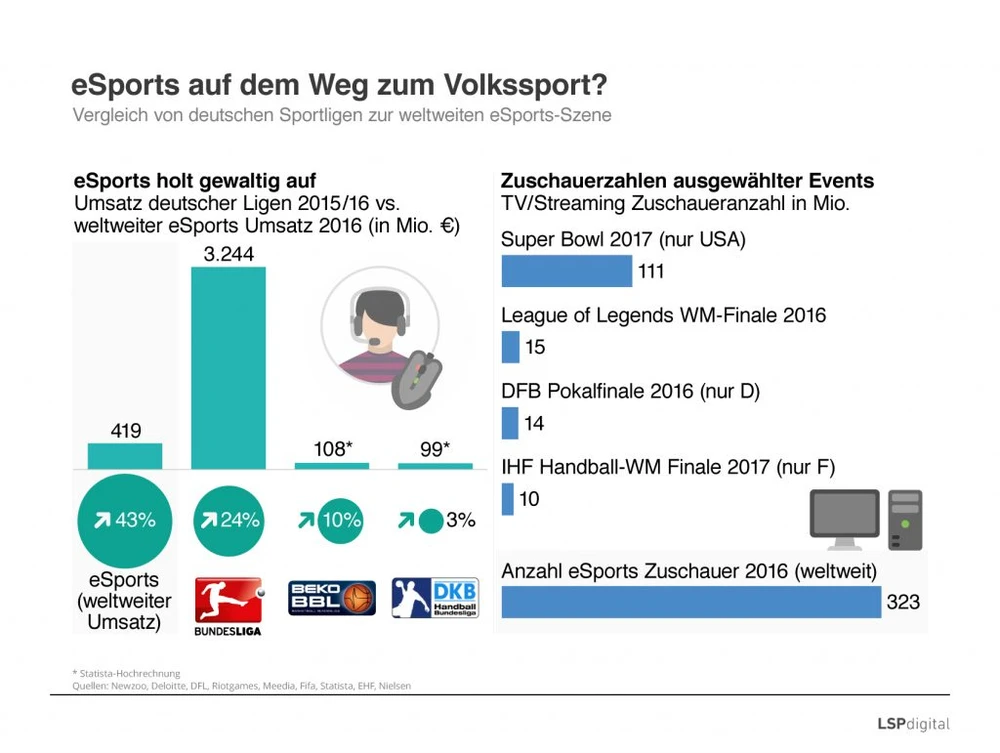 Im Fernsehen ist eSport noch recht exotisch, doch es gibt eine wachsende Fangemeinde. Wie die Strategieberatung LSP Digital berechnet hat, haben im letzten Jahr 15 Millionen Zuschauer das Finale der „Leage of Legends“-WM im Stream verfolgt – immerhin mehr Zuschauer als beim DFB-Pokal-Finale. Gemessen am weltweiten Umsatzwachstum hat eSport im Vorjahr sogar die Fußball Bundesliga in den Schatten gestellt.