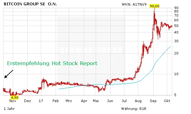 Und der Bitcoin-Boom geht weiter. Der neue Hot Stock Report befasst sich daher mit genau diesem Trend. Im Kurzcheck werden gleich mehrere brandneue Bitcoin-Hot-Stocks unter die Lupe genommen. Plus: Am Donnerstag wanderte eine weitere Aktie mit Blockchain-Bezug ins Depot 2030. Es ist eine Aktie, die aufgrund der fundamental ausgezeichnet Situation selbst für konservative Anleger interessant ist.