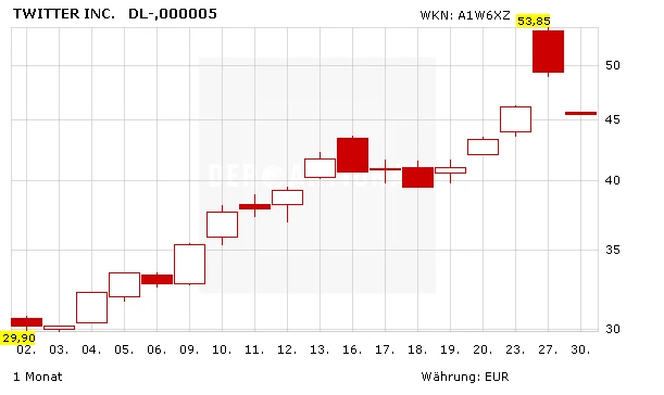 Anfang November hatte Twitter seine Aktien zum Ausgabepreis von 26 Dollar an die Börse gebracht. Das Papier machte direkt einen Sprung nach oben. In diesem Monat legte die Aktie weiter kräftig zu. Selbst nach dem Kursrutsch beträgt die Bewertung des Unternehmens noch rund 35 Milliarden Dollar (25 Milliarden Euro) - das ist mehr als die DAX -Größen Adidas oder Beiersdorf auf die Waage bringen.