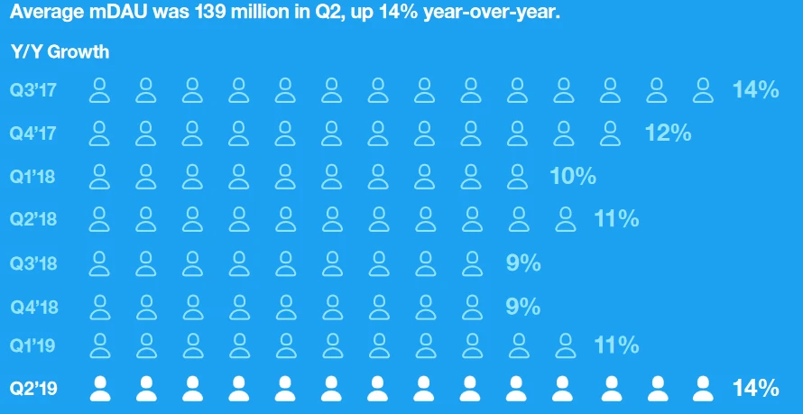 Ebenfalls über den Erwartungen lag der Nutzerzuwachs von fünf Millionen täglich aktiven „monetarisierbaren“ Nutzern (mDAU) auf insgesamt 139 Millionen. Dabei ist jedoch zu beachten, dass Twitter hier eine neue Kennzahl verwendet. mDAU sind dabei die Nutzer, denen es möglich ist, an einem bestimmten Tag Werbung anzuzeigen. Dabei sei laut Twitter diese Metrik nicht vergleichbar mit den DAU-Werten anderer sozialer Netzwerke, da diese aufgebläht seien durch Nutzer, denen überhaupt keine Werbung angezeigt wird.