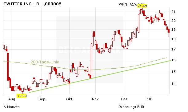 Die Twitter-Aktie fiel zum Handelsstart um rund drei Prozent auf 18,22 Euro bzw. 22,76 Dollar. Der noch junge, im Oktober begonnene Aufwärtstrend der amerikanischen Aktie gerät in Gefahr, auf Euro-Basis sieht's besser aus. Bereits engagierte Anleger sollten vorerst abwarten und dabeibleiben. Die Hoffnung auch auf einen wirtschaftlichen Turnaround bleibt bestehen.