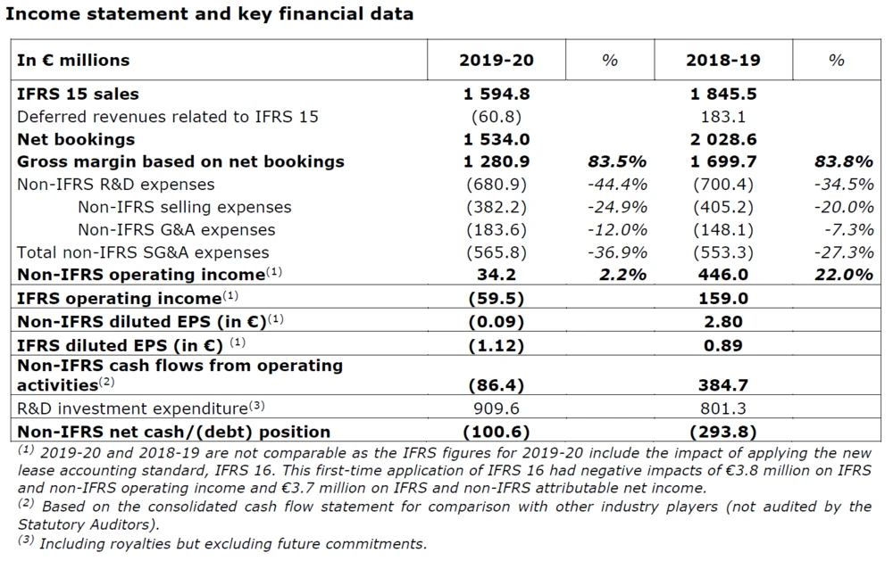 Im letzten Fiskaljahr hat der französische Spieleentwickler 1,59 Milliarden Euro Umsatz (13,6 Prozent weniger als im Vorjahr) erwirtschaftet. Der operative Gewinn fiel sogar um 92 Prozent und damit noch stärker: von 446 Millionen Euro im Vorjahr auf 34,2 Millionen Euro. Am Ende steht ein Nettoverlust von 10,2 Millionen Euro in den Büchern.