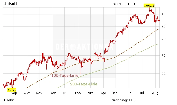 Denn Ubisoft lieferte im ersten Quartal 2019 (bis 30. Juni) hervorragende Zahlen. Die Umsätze verdoppelten sich von 202 Millionen auf 400 Millionen Euro. Angesichts dieser Rekordzahlen war es für die Unternehmensführung ein Leichtes, die Prognose für das Gesamtjahr mit Erlösen von 2,00 Milliarden zu bestätigen. Anleger zeigten sich vom anhaltenden Wachstumskurs überzeugt und hoben die Aktie nach den Zahlen auf ein neues Allzeithoch bei 106,15 Euro.
