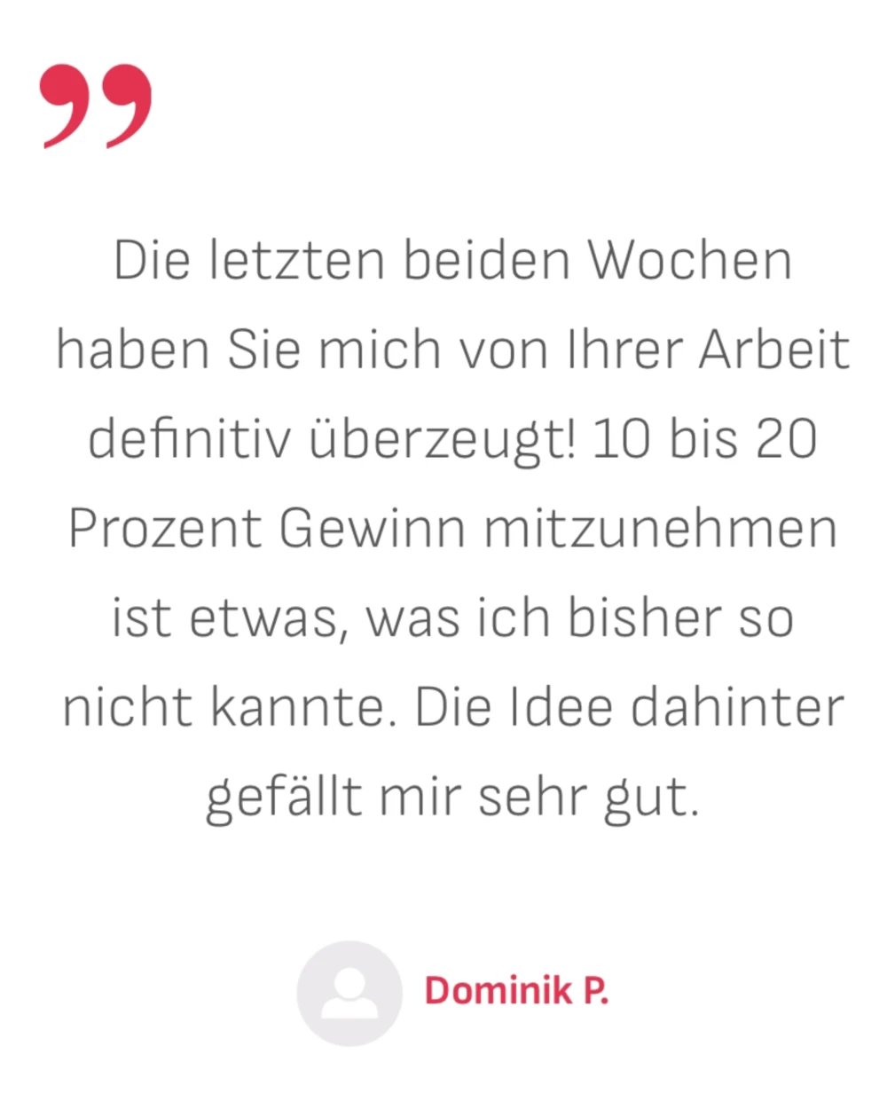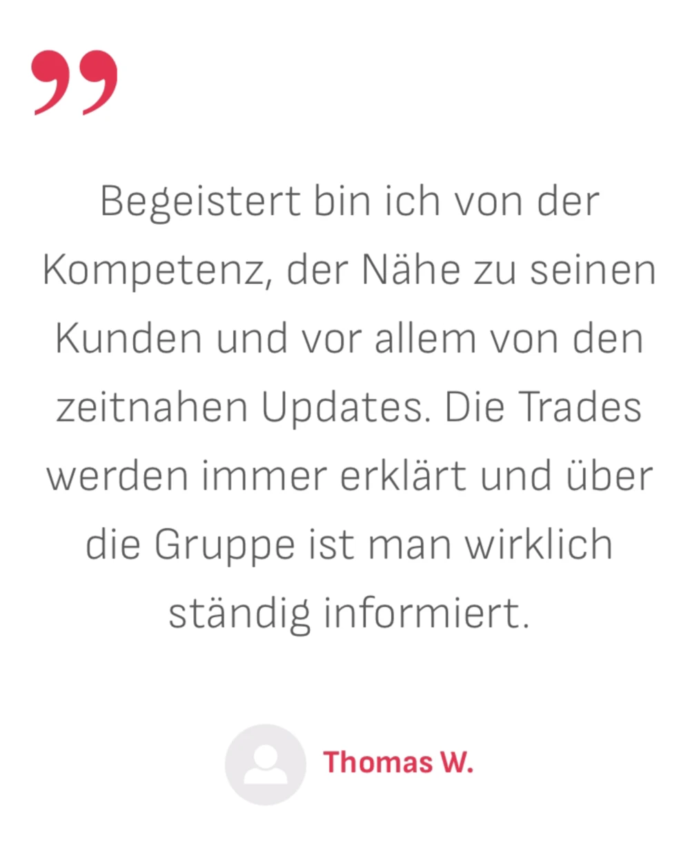 Auch hier wird der Ex-Banker und zertifizierte Financial Planner erneut auf Bewährtes setzen: eine im Hinblick auf die Teilnehmerzahl exklusive Interessentengruppe, dazu ein Messenger-Service, um sich bietende Chancen blitzschnell und rund um die Uhr zu nutzen und in bares Geld umzuwandeln, sowie eine Erfolgsstrategie der kleinen Schritte, die in Summe jedoch großen Erfolg bedeutet.