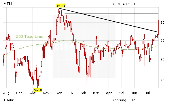 Der AKTIONÄR setzt in seinem Derivate-Musterdepot schon länger mit einem Mini-Long auf MTU (WKN CC3NED). Das Zertifikat liegt rund 5o Prozent im Plus. Nach den überraschend guten Quartalszahlen hat die Aktie der Münchener nun den mittelfristigen Abwärtstrend geknackt. Überwindet der Kurs die massiven Widerstände im Bereich 92/94 Euro, ist der Weg frei für neue Allzeithochs. Kaufen!