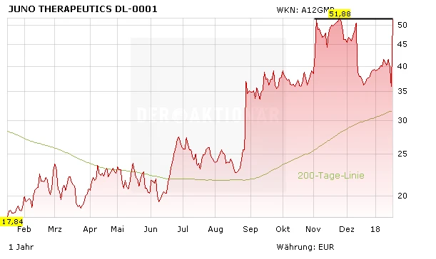 Apropos BB Biotech: Von einer möglichen Übernahme von Juno würden die Schweizer profitieren. Juno ist mit einem Anteil von 2,4 Prozent wie Celgene im Portfolio vertreten. In einer ersten Reaktion auf das Übernahmegerücht haben die Analysten der Citigroup ein Kursziel von satten 110 Dollar für Juno Therapeutics ausgerufen. Anleger sollten bei Juno an der Seitenlinie bleiben. Celgene hingegen ist als Comeback-Spekulation für das Jahr 2018 eine gute Wahl. Konservative Anleger partizipieren mit einem Investment in BB Biotech an einem möglichen Mega-Deal.