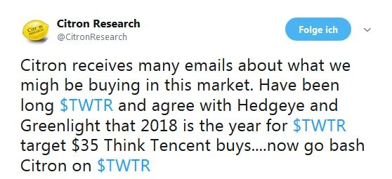 Übersetzung: „Citron erhält per E-Mail zahlreiche Nachfragen, was wir in diesem Markt kaufen würden. Wir sind long in Twitter und stimmen Hedgeye (Finanzanalyse- und Medienfirma) und Greenlight (Hedgefonds) zu, dass 2018 das Jahr für Twitter sein dürfte. Das Kursziel liegt bei 35 Dollar und wir denken, dass Tencent kaufen wird…legt los und verprügelt Citron auf Twitter.“