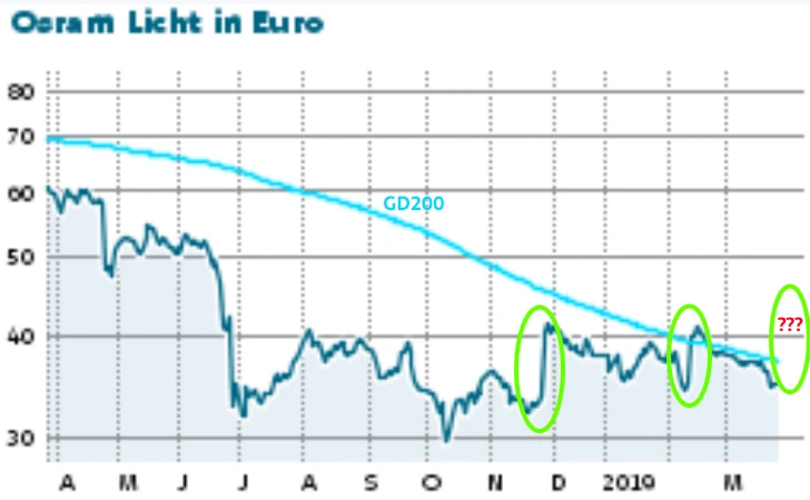 Legt man aber die übliche Übernahmeprämie von 20 Prozent zugrunde, dann müsste ein Übernahmeangebot bei Osram Licht klar über 40 Euro liegen. Unterstellt man der Gesellschaft einen erfolgreichen Abschluss der laufenden Transformationsphase und eine Belebung der Umsätze samt einer nachhaltigen Steigerung der Margen, dann könnte sogar eine Fünf vor dem Komma stehen. Zur Erinnerung: Die wirtschaftliche Abkühlung trifft den Konzern im laufenden Umbau. Um die Abhängigkeit von der Automobil- und der Smartphone-Industrie zu reduzieren, soll der Fokus auf das Photonikgeschäft gelegt werden. Möglicherweise muss das Sparprogramm verschärft werden.