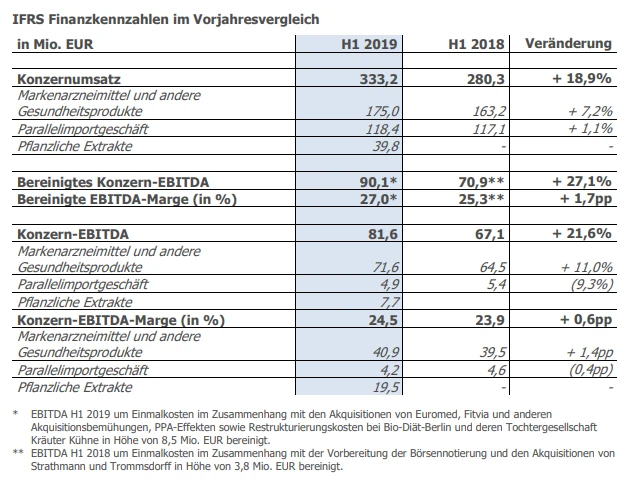 Im Zeitraum Januar bis Juni legten die Umsätze im Vorjahresvergleich um 18,9 Prozent auf 333,2 Millionen Euro zu, wie der Konzern am Donnerstag im bayerischen Grünwald mitteilte. Das um Einmaleffekte bereinigte Ergebnis vor Zinsen, Steuern und Abschreibungen (Ebitda) wuchs um 27,1 Prozent auf 90,1 Millionen Euro. Die bereinigte operative Marge stieg auf 27 Prozent. Damit bestätigte Dermapharm zugleich seine vorläufigen Geschäftszahlen für das erste Halbjahr von Ende August. Unter dem Strich verdiente Dermapharm mit 39,4 Millionen Euro leicht mehr.