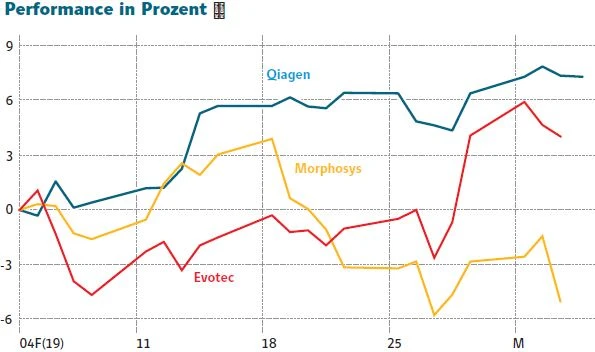 Während derzeit die Aktie von Evotec und Morphosys etwas schwächeln, klettert derzeit ein anderer MDAX-Biotech-Wert von Hoch zu Hoch: Qiagen. Die Aktie hat im 4-Wochen-Vergleich gut sieben Prozent zugelegt, wohingegen Morphosys mehr als fünf Prozent verloren hat. Evotec mit einem Plus von 4,6 Prozent befindet sich aber zumindest auf Tuchfühlung. Längerfristig betrachtet haben Evotec und Morphosys aber weiter klar die Nase vorn.