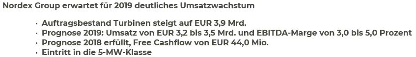 Der Windkraftanlagenhersteller Nordex ist mit einem gut gefüllten Auftragsbuch in das neue Jahr gestartet und erwartet einen deutlichen Umsatzanstieg im laufenden Jahr. Der Auftragsbestand für neue Windenergieanlagen (Segment Projekte) lag zum Jahresende 2018 bei 3,9 Milliarden Euro (31. Dezember 2017: 1,7 Milliarden Euro). Für das laufende Geschäftsjahr erwartet das Unternehmen ein Konzernumsatz von 3,2 bis 3,5 Milliarden Euro. Die Prognosen der Analysten lagen bislang bei knapp drei Milliarden Euro. Für das vergangene Geschäftsjahr 2018 hatte Nordex 2,46 Milliarden Euro ausgewiesen, ein Rückgang um gut ein Fünftel. Damit wurden die im Februar veröffentlichten vorläufigen Ergebnisse bestätigt.