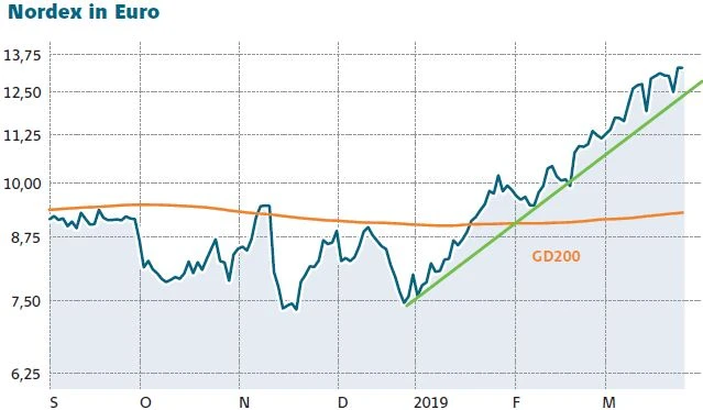 Die Aktie von Nordex reagiert am Morgen mit einem kräftigen Kurssprung von knapp fünf Prozent. Damit setzt das Papier seinen seit Anfang des Jahres ausgebildeten Aufwärtstrend fort. Angesichts der zuletzt extrem steilen Aufwärtsbewegung drängt sich derzeit kein Neueinsteig mehr auf. DER AKTIONÄR favorisiert den dänischen Weltmarkführer Vestas.