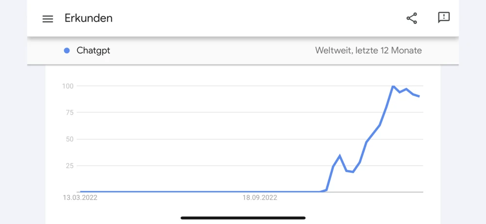 Microsoft schreibt in einem Blogbeitrag, dass dank des KI-Chats bereits 100 Millionen User täglich auf Bing aktiv sind. Ein Drittel davon seien dabei völlig neue Interessenten, die dank ChatGPT den Weg zur neuen, modernen Suche gefunden haben. Die Smartphone-App Bing werde sogar sechs Mal so viel verwendet wie bisher. "Es ist unglaublich", so ein Microsoft-Manager, wie schnell sich das neue KI-Produkt in einem Monat seit Start entwickelt habe. Folgende Grafik zeigt, dass auch das allgemeine Google-Such-Interesse an ChatGPT enorm hoch bleibt.