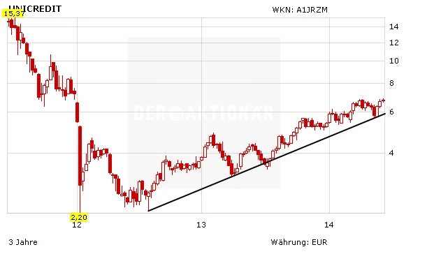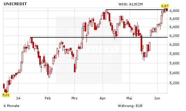 Die Unicredit-Aktie scheint derzeit nicht zu stoppen. Seit dem kurzen und heftigen Rücksetzer auf den langfristigen Aufwärtstrend bei 5,80 Euro geht es mit dem Kurs kontinuierlich nach oben. Am Dienstag markierte die Aktie mit 6,873 Euro den höchsten Stand seit dem Herbst 2011.