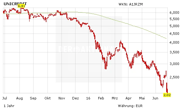 In den Marktturbulenzen nach dem Brexit-Votum war die Aktie der UniCredit bereits am Freitag um 23 Prozent eingebrochen. Auch am Montag geht die Talfahrt weiter – mittlerweile ist der Kurs auf ein neues Rekordtief abgerutscht. In Anbetracht der operativen Probleme und katastrophalen Chartbildes sollen Anleger die Aktie derzeit meiden.