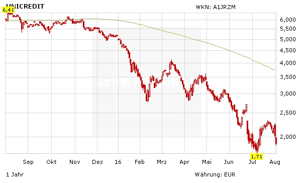 Die UniCredit-Aktie knüpft am Dienstagvormittag an ihre rasante Talfahrt vom Vortag an und verliert in der Spitze rund sieben Prozent. Damit nähert sich der Kurs immer weiter dem Allzeittief bei 1,70 Euro an.