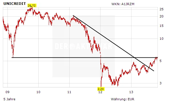 Der Sparkurs von Premierminister Enrico Letta wird sich für Italien auszahlen. Das Land ist auf einem guten Weg aus der Krise. Das sollte auch die Aktie der Unicredit weiter antreiben. Die Charttechnik spricht klar für weiter steigende Kurse, sobald der markante Widerstand bei 5,60 Euro nachhaltig geknackt wird. DER AKTIONÄR bleibt bei seinem Kursziel von 7,40 Euro, der Stopp sollte auf 4,50 Euro nachgezogen werden.