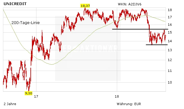 Bis dahin hat die Unicredit-Aktie jedoch noch einige charttechnische Widerstände zu überwinden. Bei 15,50 Euro hindert zunächst das Zwischentief von Anfang Januar den Kursaufschwung, bei 16,40 Euro folgt dann die 200-Tage-Linie. Und die größte Hürde wartet dann bei gut 18 Euro, wo der Italo-Wert seit Juni 2017 bereits mehrfach scheiterte. Heute Morgen notiert die Aktie bei 14,55 Euro. DER AKTIONÄR bleibt vorerst an der Seitenlinie.