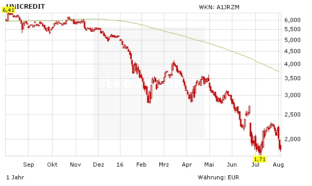 Die UniCredit-Aktie ist nach der Veröffentlichung des Quartalsberichts erneut deutlich gefallen und wurde daraufhin an der Börse in Mailand zeitweise vom Handel ausgesetzt. Seit Jahresbeginn hat der Konzern nun rund zwei Drittel an Börsenwert verloren – allein seit Beginn der Woche beläuft sich das Minus auf rund 20 Prozent. Entsprechend bleibt DER AKTIONÄR bei der Empfehlung, das Papier zu meiden.
