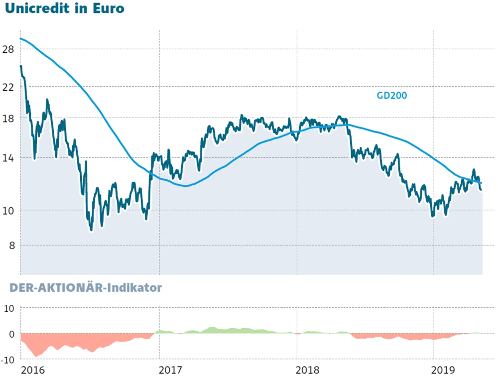 Trotz des Gewinnsprungs im ersten Quartal verzeichnet die Unicredit-Aktie am Donnerstag moderate Verluste. Verglichen mit dem europäischen Referenzindex Stoxx 600 Banks schlägt sich das Papier damit aber noch vergleichsweise wacker. Ein (Wieder-)Einstieg bei der italienischen Bank drängt sich auf dem aktuellen Niveau jedoch nicht auf.