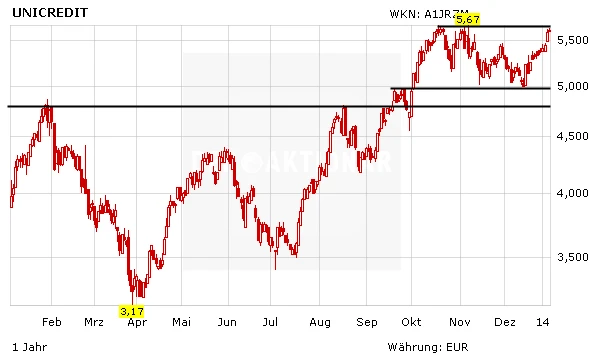 Die Unicredit bleibt eine der spannendsten Aktien im europäischen Bankenmarkt. DER AKTIONÄR bleibt für die Anteile der Großbank zuversichtlich gestimmt. Nach dem erfolgreichen Test der Unterstützung bei 5,00 Euro sieht es auch aus charttechnischer Sicht gut aus. Die Unicredit-Titel bleiben daher ein Kauf (Stopp: 4,30 Euro).
