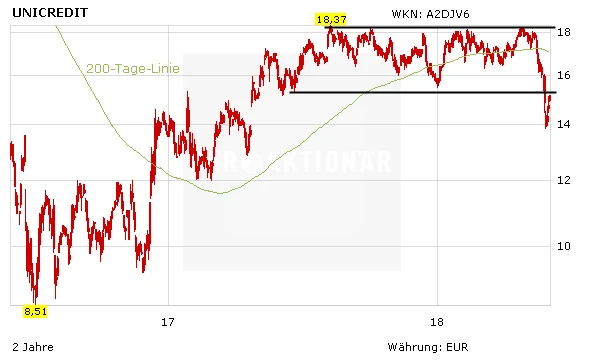 Beide Werte gewannen am Montag zeitweise mehr als drei Prozent hinzu. Die UniCredit-Aktie hatte mit der Verschärfung der Situation in Italien seit Mitte Mai gut 20 Prozent an Wert verloren und dabei auch den Seitwärtskanal verlassen, in dem sie sich seit einem Jahr bewegte. DER AKTIONÄR steht Bankaktien derzeit allgemein skeptisch gegenüber, UniCredit erscheint mit der Fusionsfantasie noch haltenswert. Jedoch sollte bei 13 Euro eine Stopp-Loss-Marke gesetzt werden.