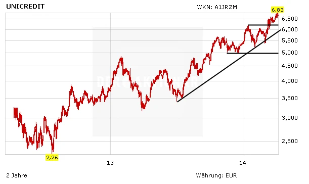 Indes hat die Aktie der Unicredit in den vergangenen Handelstagen weiter zulegen können. Momentum und Charttechnik sprechen weiterhin klar für die Aktie, die allerdings mit einem 2014er-KGV von 20 längst kein Schnäppchen mehr ist. Einen Neueinstieg sollten daher nur mutige Anleger in Betracht ziehen. Bereits investierte Anleger sollten weiterhin dabeibleiben und sich an den Kursgewinnen erfreuen.