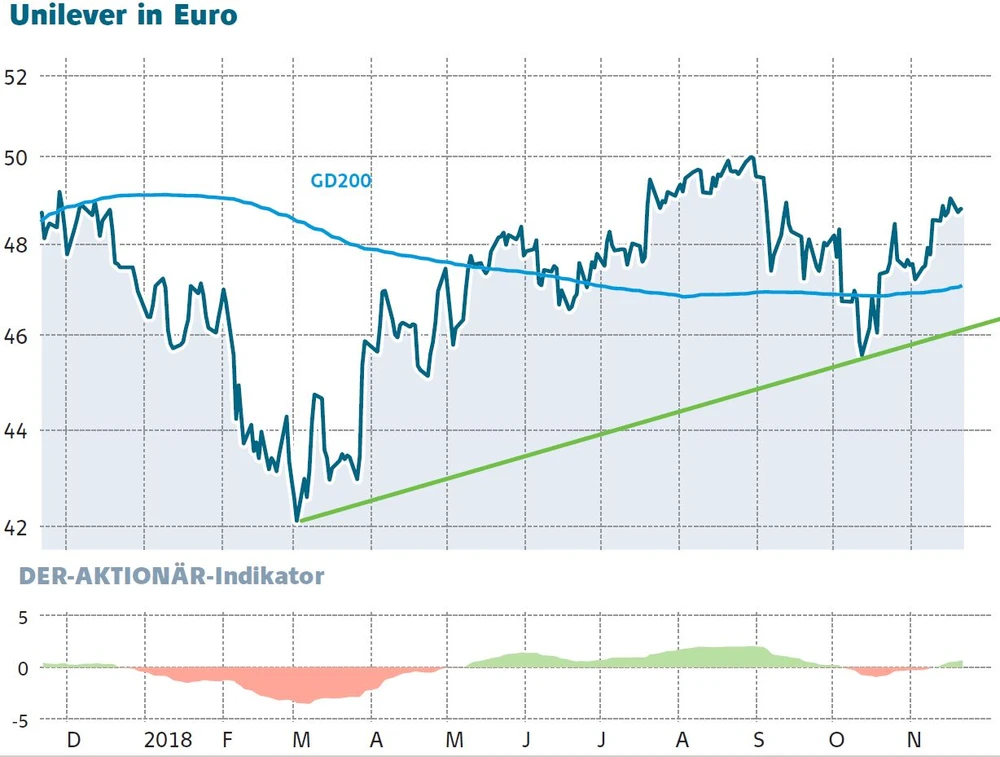 Aufgrund der starken Position in wachsenden aufstrebenden Märkten wirkt das 19er-KGV von Unilever im Vergleich zu anderen europäischen Konsumgüter-Riesen attraktiv. Ebenfalls attraktiv ist der Chart der Unilever-Aktie: Im schwachen Markt hat der Chart auf den langfristigen Aufwärtstrend aufgesetzt und wenige Tage später die 200-Tage-Linie zurückerobert. Ein Kaufsignal!
