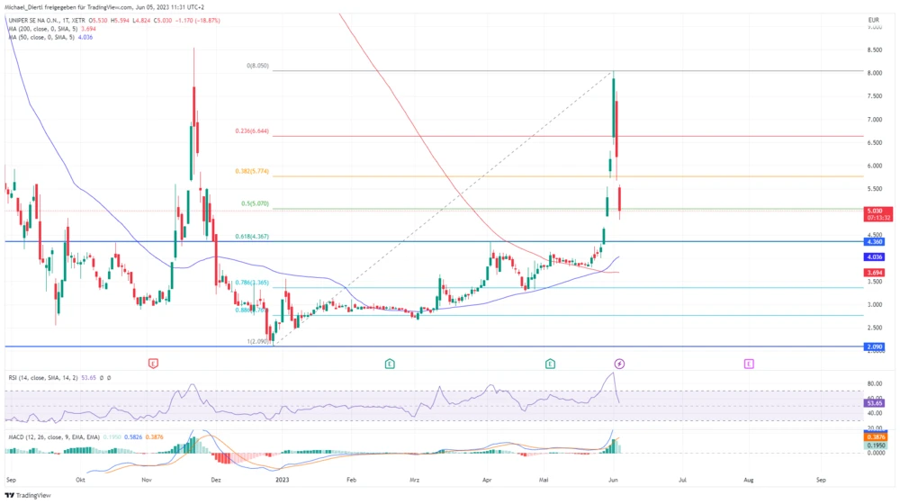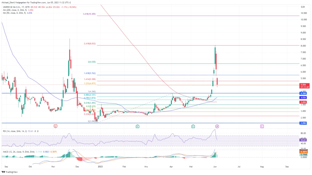 Aus technischer Sicht war es nur eine Frage der Zeit, bis die Korrektur bei Uniper beginnt. Zwar hätte die Aktie theoretisch noch Potenzial bis zur 361,8%-Fibonacci-Extension bei 10,30 Euro gehabt. Doch angesichts der rasanten Kursgewinne war die Wahrscheinlichkeit für eine Korrektur nach dem Erreichen der 261,8%-Fibonacci-Extension bei 8,03 Euro deutlich höher.