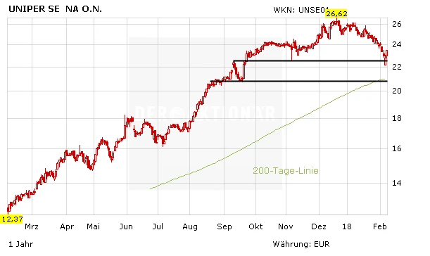 Die Situation bei Uniper bleibt unübersichtlich. Auch wenn Fortum das Gegenteil behauptet: Es könnte durchaus sein, dass die Finnen über den Kapitalmarkt weitere Anteile kaufen und den Aktienkurs damit antreiben. Darauf spekulieren auch Hedgefondsmanager wie Paul Singer, die beim MDAX-Konzern investiert sind. Aktuell fehlen den deutschen Versorger-Aktien aber die Impulse, eine Seitwärtsbewegung droht. Neueinsteiger sollten deshalb abwarten. Wer bereits an Bord ist, bleibt dabei und setzt den Stopp knapp unterhalb des Fortum-Angebots je Aktie.