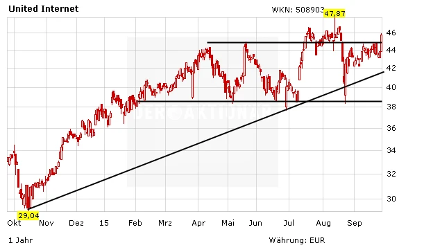Der Aufwärtstrend bei United Internet ist weiterhin intakt. Durch das Kursplus am Freitag hat sich die Lage noch weiter verbessert. Der horizontale Widerstand bei 44,50 Euro wurde überwunden. Damit rückt das Allzeithoch bei 47,87 Euro nun noch stärker in den Fokus. Nach unten sichert neben dem alten Widerstand auch der Aufwärtstrend bei rund 42 Euro ab. Zudem verläuft bei 38,50 Euro eine massive horizontale Unterstützung.