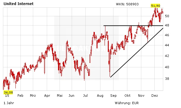 Aus charttechnischer Sicht ist die Lage bei United Internet ebenfalls sehr gut. Durch das beständige Wachstum der vergangenen Monate und Jahre hat sich eine sehr stabile Aufwärtsbewegung herausgebildet. Dieser langfristige Trend verläuft derzeit bei rund 43 Euro und bietet einen stabilen Schutz vor deutlicheren Rücksetzern. Zudem sichert oberhalb davon bereits die horizontale Unterstützung bei 48 Euro ab. Gelingt nun der Ausbruch über das Allzeithoch bei 51,90 Euro, sind zudem weitere schnelle Gewinne möglich.