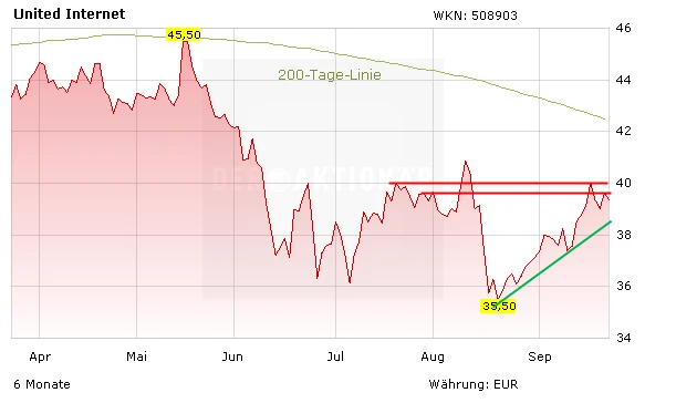 Die Aktie von United Internet hat sich im Bereich von 35,50 Euro gefangen und seitdem einen soliden Aufwärtstrend entwickelt. Momentan notiert die Aktie bei 39,36 Euro. Nächste Widerstände lauern bei rund 39,60 Euro und 40,00 Euro.