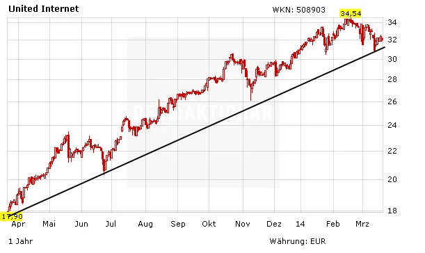 Am 27. März veröffentlicht United Internet seine Jahreszahlen. Die Analysten erwarten ein stabiles Wachstum bei dem Internetunternehmen. Vor allem ein guter Ausblick könnte dafür sorgen, dass der langfristige Aufwärtstrend weiterhin intakt bleibt. Derzeit notiert der Kurs nur noch knapp oberhalb des Trends bei gut 32 Euro. Ein Bruch dieser Marke könnte die Aktie stark unter Druck setzen.