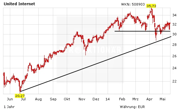 Die Papiere von United Internet zählen am Montag zu den größten Gewinnern im TecDAX. Durch den Kurssprung könnte die Konsolidierung der vergangenen Wochen beendet worden sein. Zuletzt hat zudem die horizontale Unterstützung bei 31 Euro gehalten, was ebenfalls bullish zu werten ist. Investierte Anleger bleiben dabei. Das Kursziel des AKTIONÄR liegt weiterhin bei 35,70 Euro.