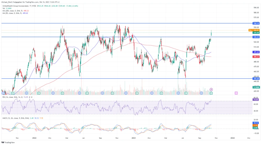 Nicht nur fundamental, sondern auch charttechnisch hat sich die Lage für UnitedHealth in den letzten Wochen deutlich verbessert. Die Bullen konnten schon vor rund einem Monat ein sogenanntes Golden Cross – dabei kreuzt der GD50 den GD200 von unten nach oben – nutzen, um den Kurs in Richtung des Jahreshoch bei 530,45 Dollar zu treiben.