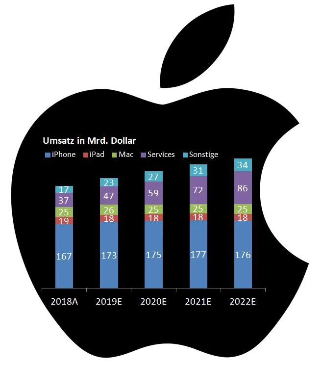 Das Service-Geschäft ist durch einen hohen Anteil an wiederkehrenden Umsätzen gekennzeichnet. Derartige Geschäftsmodelle werden an der Wall Street hoch bewertet. Experten taxieren alleine den Wert des Servicegeschäfts in wenigen Jahren auf 80 Prozent des aktuellen Börsenwertes von 966 Milliarden Dollar. Damit bleib die Frage, welchen Wert man dem Hardwaregeschäft mit schätzungsweise mehr als 250 Milliarden Dollar Umsatz in vier Jahren beimessen kann. Derzeit werden dafür Multiples von zwei bis drei bezahlt, macht also einen Wert von 500 bis 750 Milliarden Dollar. Diese einfache Überschlagsrechnung zeigt, dass die Apple-Aktie derzeit günstig ist.
