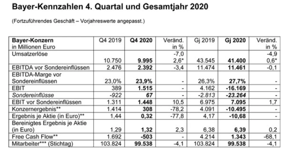 Im vierten Quartal generierte Bayer einen Umsatz von knapp zehn Milliarden Euro, was moderat unter der Analystenschätzung (vom Montag) von 10,1 Milliarden Euro liegt. Auch das EBITDA mit 2,39 Milliarden Euro verfehlte die Prognose von 2,45 Milliarden Euro leicht.
